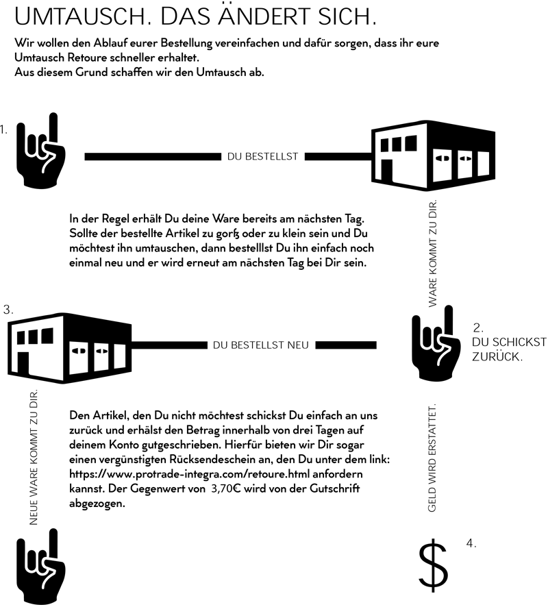 In future, returned goods will be reimbursed as a lump sum instead of exchanging them. If an exchange for a different size is desired, this must be ordered and paid for again via the online shop.